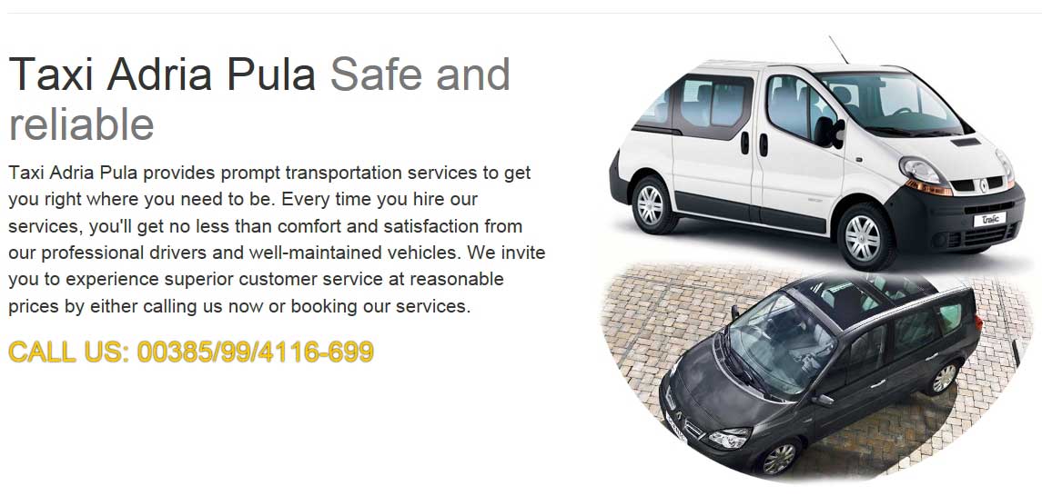 Taxi Adria Pula provides prompt transportation services to get you right where you need to be. Every time you hire our services, you’ll get no less than comfort and satisfaction from our professional drivers and well-maintained vehicles. We invite you to experience superior customer service at reasonable prices by either calling us now or booking our services.