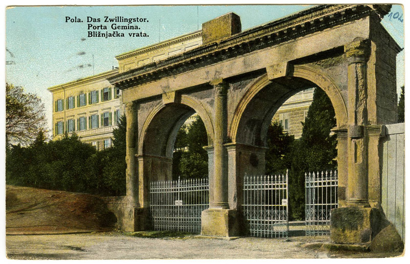 Excavation of the Twin gates was completed in the beginning of the 19th century, because upper arches became visible but in 1831, a white marble plate was found on which Lucius Menasius Priscus, who built one of the aqueducts on his own expense, is mentioned. The inscription is located on the central upper part of the gates, where it was installed in 1857 by Pietro Kandler.
